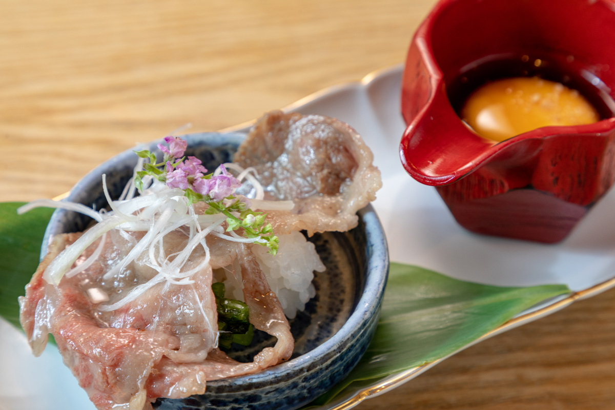スキヤキのタレに卵黄を浮かべ、それを一枚焼きにした牛バラスライスに乗ったスキヤキの具材×俵おむすびにかけ、一巻きしてお召し上がり頂きます。