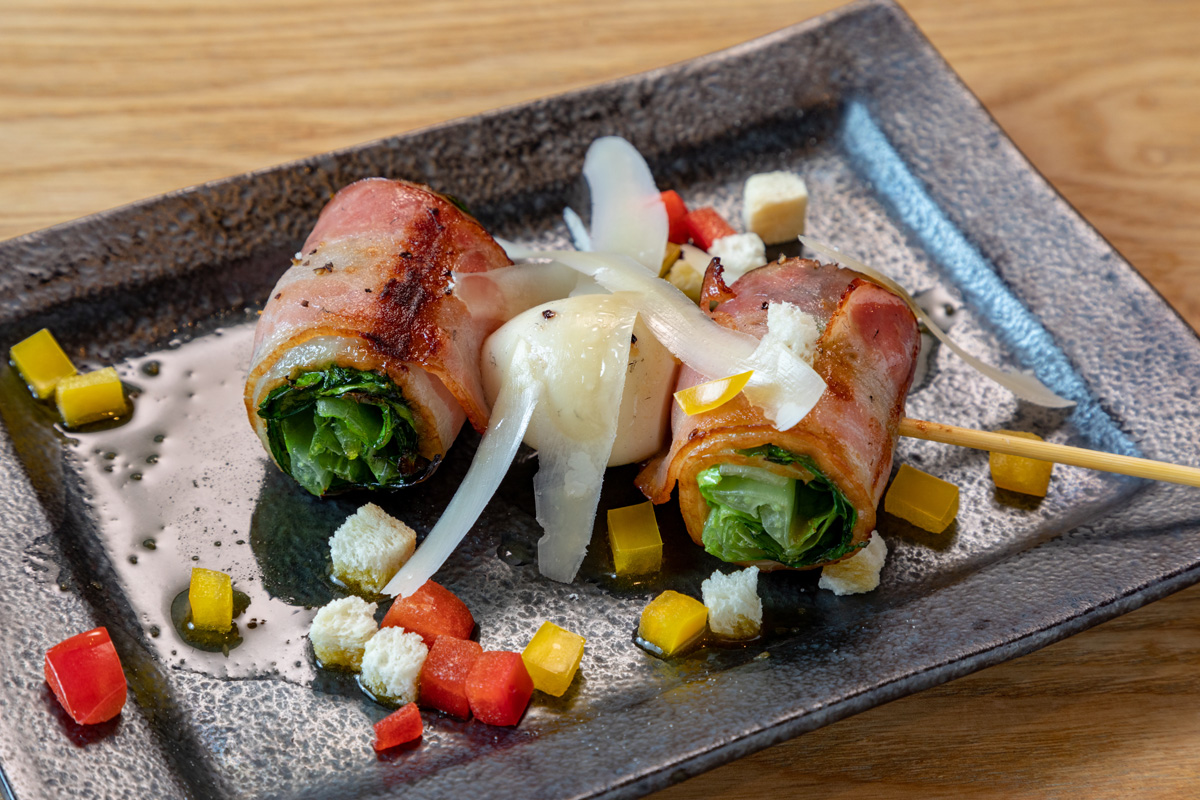 糸島産のロメインレタスをベーコンで巻いて串にしました。
