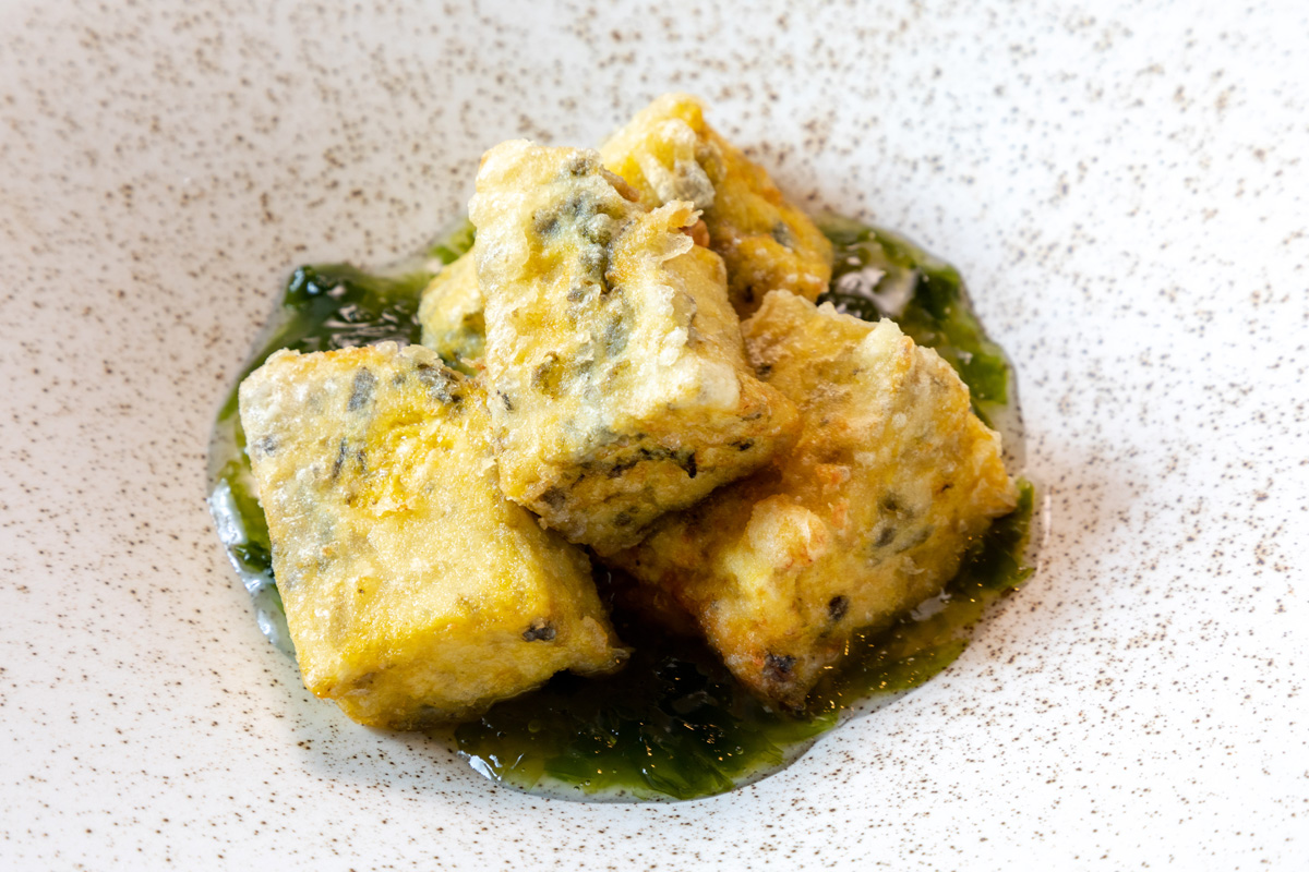 だし巻玉子の中には糸島産のカキと太もずくを入れて甘めのダシで巻き、それを天ぷらにします。その上からアオサの庵をかけて甘めのだし巻玉子の天ぷらと塩味のきいたアオサの庵がマッチした糸島の海をイメージした逸品です。